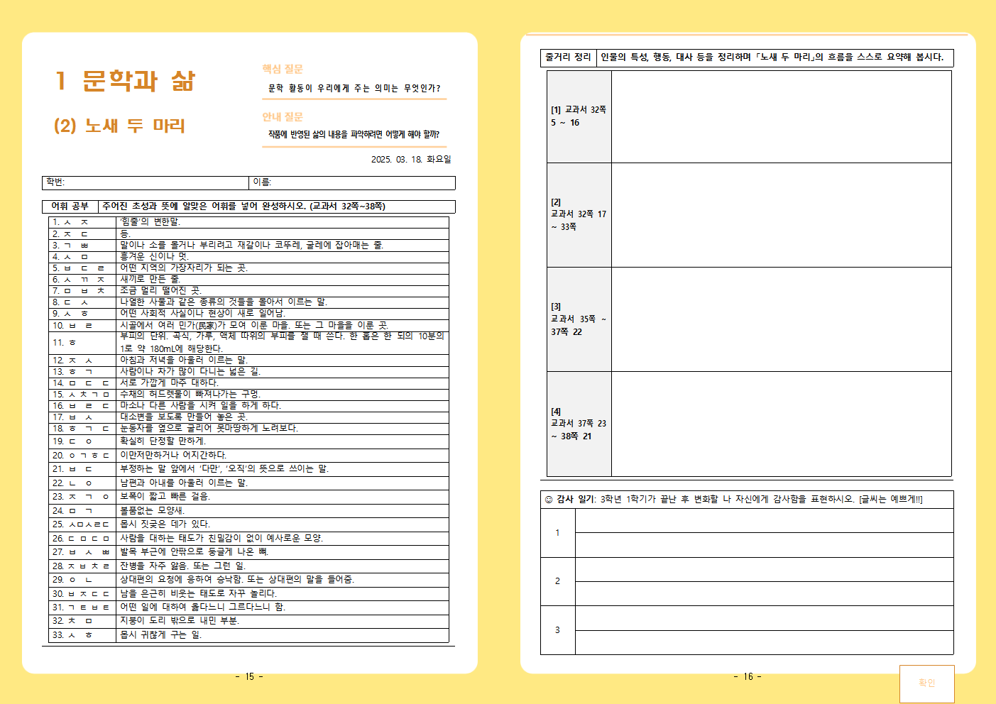 학습지 내용은 작년 8월 말, 포천교육지원청에서 진행한 국어 수업 연수 강사이신 대평고 김영희 선생님의 자료를 참고해서 만들었다.
