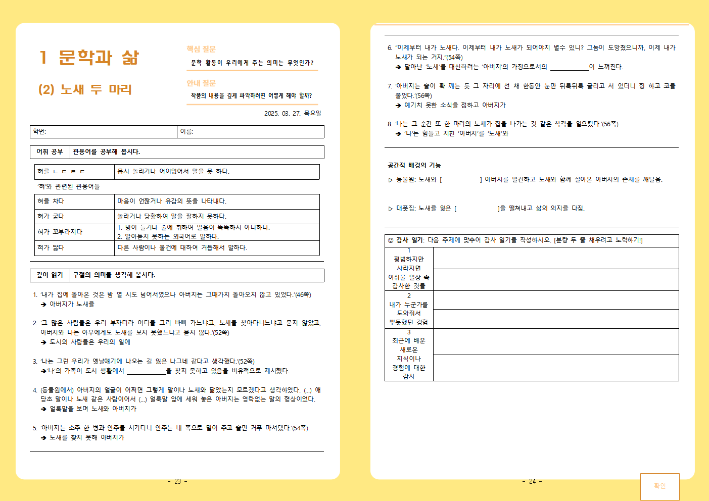아무튼 요래저래 시험에 자주 나오는 부분을 체크하고, 그 의미를 아이들과 생각해보기 위해 학습지를 만들었다.