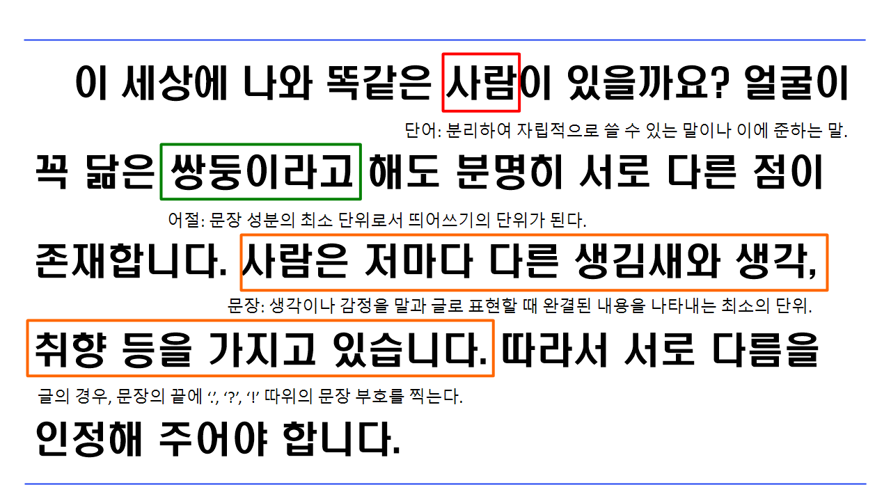 ⓐ 글 읽기를 학습할 때 알아야 하는 개념인 단어, 어절, 문장, 문단을 익히고(이런 당연히 모를 거라 생각함ㅎㅎㅎ)